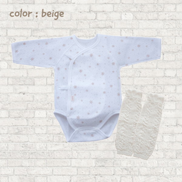 【ご好評により継続して販売します!】 ●商品内容 ・長袖打ち合わせロンパース(スナップボタン式)×1枚 レッグウォーマー×1足 ・サイズ:長袖打ち合わせロンパース→60-70cm レッグウォーマー→フリーサイズ(幅約7cm、総丈約27cm) ・使用生地:長袖打ち合わせロンパース→ニットキルト(表・裏:綿100%、中わた:ポリエステル100%) レッグウォーマー→綿70%、アクリル30% ・ロンパースの柄:雪の結晶柄 ・カラー:⑴ベージュ→ロンパース(雪の結晶柄ベージュ)、レッグウォーマー(ホワイト) ⑵グレー→ロンパース(雪の結晶柄グレー)、レッグウォーマー(グレー) ・日本製 ●ロンパースの特徴 ・保温性に優れた国産ニットキルト生地を使用しています。