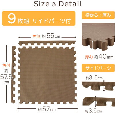 極厚40mm 大判60cm ジョイントマット 9枚組 仕様 入数 同色9枚組 サイズ ●サイドパーツを含む1枚あたりのサイズ: (約)横幅58×縦幅58cm×厚さ40mm ●サイドパーツを含まない1枚あたりのサイズ: (約)横幅57×縦幅57cm×厚さ40mm 材質 EVA(エチレン・ビニール・アセテート)素材 使用上のご注意 ●床材等の種類によっては、長時間同じ場所に置いておくと床材表面がマット裏面に移行する可能性があります。